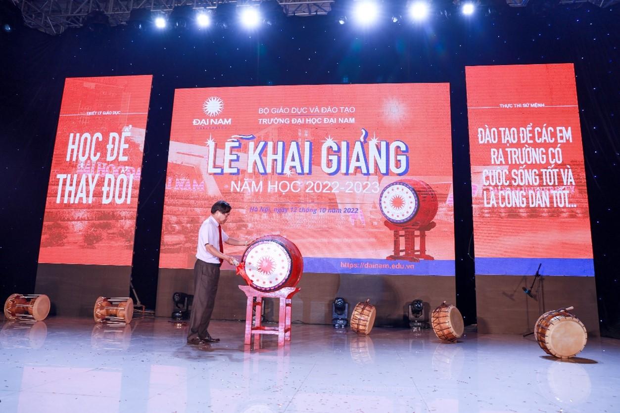 In the solemn and bustling atmosphere of the Opening Ceremony of the 2022 - 2023 school year and the Grand Concert to Welcome New Students of K16 (evening of October 12), Dr. Le Dac Son - Chairman of the Board of Directors of Dai Nam University beat the drum to open the new school year, warmly welcoming nearly 3,000 new students of the 16th course (K16) to officially join the common home of Dai Nam University.