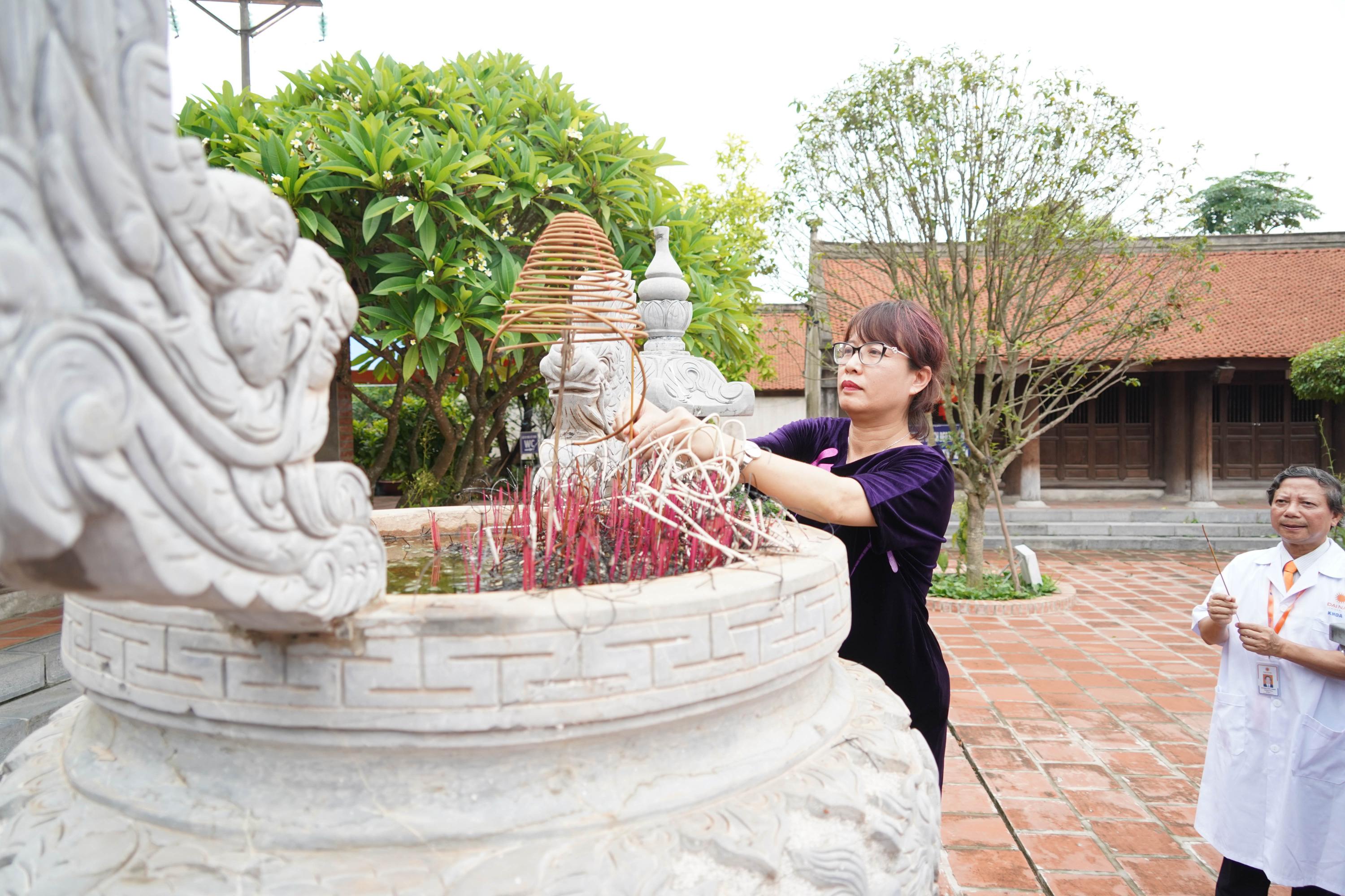At the historical and cultural relic of the Stele Temple, a delegation of cadres, lecturers, and medical students from Dai Nam University solemnly held an incense offering ceremony, respectfully bowing to the life and career of the famous physician Zen Master Tue Tinh.